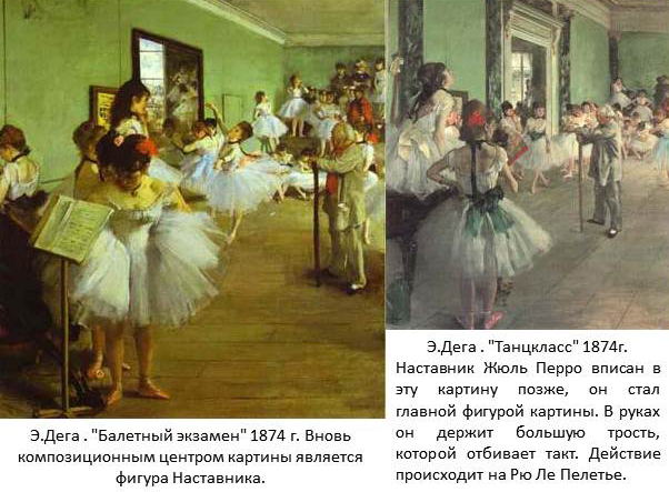Главным хореографом Императорского театра становится Мариус Петипа (старший брат Люсьена Петипа), продолживший начинания Перро. В 1859 году, вернувшись в Париж, Перро вновь появляется в Опере - старой Опере на Рю Ле Пелетье. И с той поры мы можем видеть его - по крайней мере те, кто видел картины французского художника Эдгара Дега. На многих картинах Дега, посвященных балеринам и повседневной жизни Парижской Оперы, сначала старой, а затем и новой Оперы Гарнье, художник множество раз изобразил Жюля Перро - Наставника. Так его называли в Опере. (Вот тут-то я сообразила, что ещё на школьных и институтских лекциях по истории искусства я, оказывается, столько раз видела на слайдах картин Дега именно Жюля Перро!..) Имя прославленного Жюля Перро, через классы которого прошли несколько поколений балерин Парижской Оперы, было известно всем. О нём говорили, что он незримо присутствует за всеми постановками, что он один из тех, кого можно называть "незримой Душой Оперы". Интересно, что Дега, чьи "балетные" серии пользовались особенным успехом у публики и коллекционеров, часто даже вписывал фигуру Жюля Перро в уже законченные картины. В тех картинах, где Перро на первый взгляд не присутствует как одно из главных действующих лиц и композиционный центр, Дега зачастую давал его смутный силуэт с его неизменной тростью где-нибудь на заднем плане в тени. Почему? Потому что без Перро не могло быть подлинной атмосферы Гранд Опера? Мне представляется несомненным, что Гастон Леру, хорошо знакомый с "Оперными" сериями Дега и с зарисовками к ней, изучавший их, когда писал роман, не мог пропустить такую личность, как "уродливый гений" Жюль Перро (жизнь которого сама по себе выглядит романом), - выдающийся творческий человек, новатор в своём искусстве, чья личность неразрывно связует старую и новую Парижскую Оперу, словно бессмертный Дух Искусства и Таланта, - но главное, тот Жюль Перро, которого называли в Опере просто Наставник, и который "создал" блистательную Карлотту Гризи, примадонну Гранд Опера с мировой славой. Что ещё нужно, чтобы напомнить внимательному читателю об Эрике?