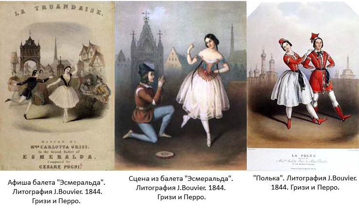 Перро и Гризи танцуют вместе - на сцене Театра Her Majesty's (как вы, конечно, помните, этот театр с 1986 г. является вместилищем самого знаменитого мюзикла Эндрю Ллойд Уэббера "Призрак Оперы" - лучшего воплощения этой темы) . Перро ставит балеты, много хореографических находок и успешных постановок: "Альма, или Мертвая Девушка" (1842) для знаменитой балерины Фанни Черрито, "Ундина" (1843), "Эсмеральда" (1844), "Суд Париса" (1846). Между прочим, именно благодаря его поискам и экспериментам мужской танец перешел из разряда "вспомогательного" в разряд самоценного хореографического явления, и в балете появились сложные по рисунку самостоятельные партии танцоров. В Лондоне Перро создал также свой знаменитый Pas de Quatre для 4-х известнейших балерин своего времени (и не только своего): Карлотты Гризи, Марии Тальони, Люсиль Гран и Фанни Черрито. Премьера его состоялась 12 июля 1845 года и вошла в историю балета не только как признанный хореографический шедевр, но и как успешная попытка объединить на одной сцене 4-х "Супер Звёзд", как сказали бы сейчас, имеющих запутанные и крайне осложненные взаимной конкуренцией отношения. (Подробности этой постановки - в статье о Карлотте Гризи)